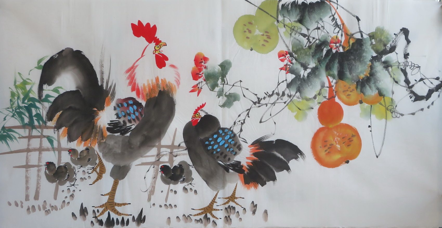 手绘花鸟国画公鸡大吉大利图客厅装饰横幅字画特价四尺HF9012404热门设计联盟服务商